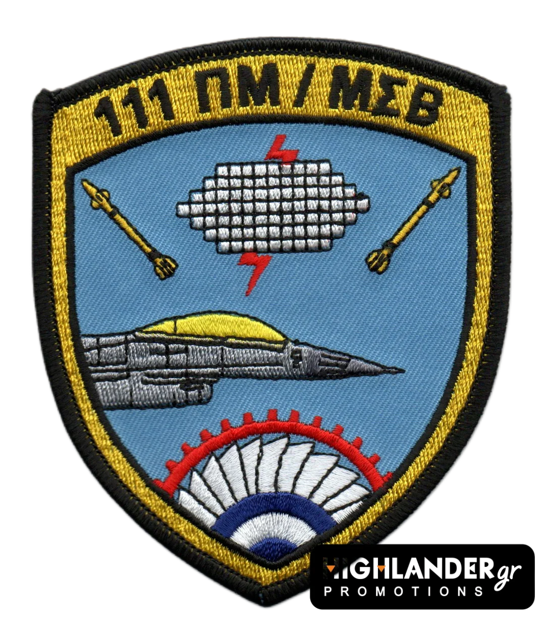 Ραφτό έμβλημα της 111 Πτέρυγας Μάχης / Μοίρας Συντήρησης Βλημάτων (ΜΣΒ), με εντυπωσιακή απεικόνιση πολεμικού αεροσκάφους F-16, ελληνικής ροδέλας και συνδυασμένων συμβόλων που υποδηλώνουν ηλεκτρονικό πόλεμο, εφοδιασμό και υποστήριξη βλημάτων. Ένα έμβλημα με έντονο συμβολισμό και υψηλή ποιότητα κεντήματος, ιδανικό για στρατιωτικό προσωπικό ή συλλέκτες.