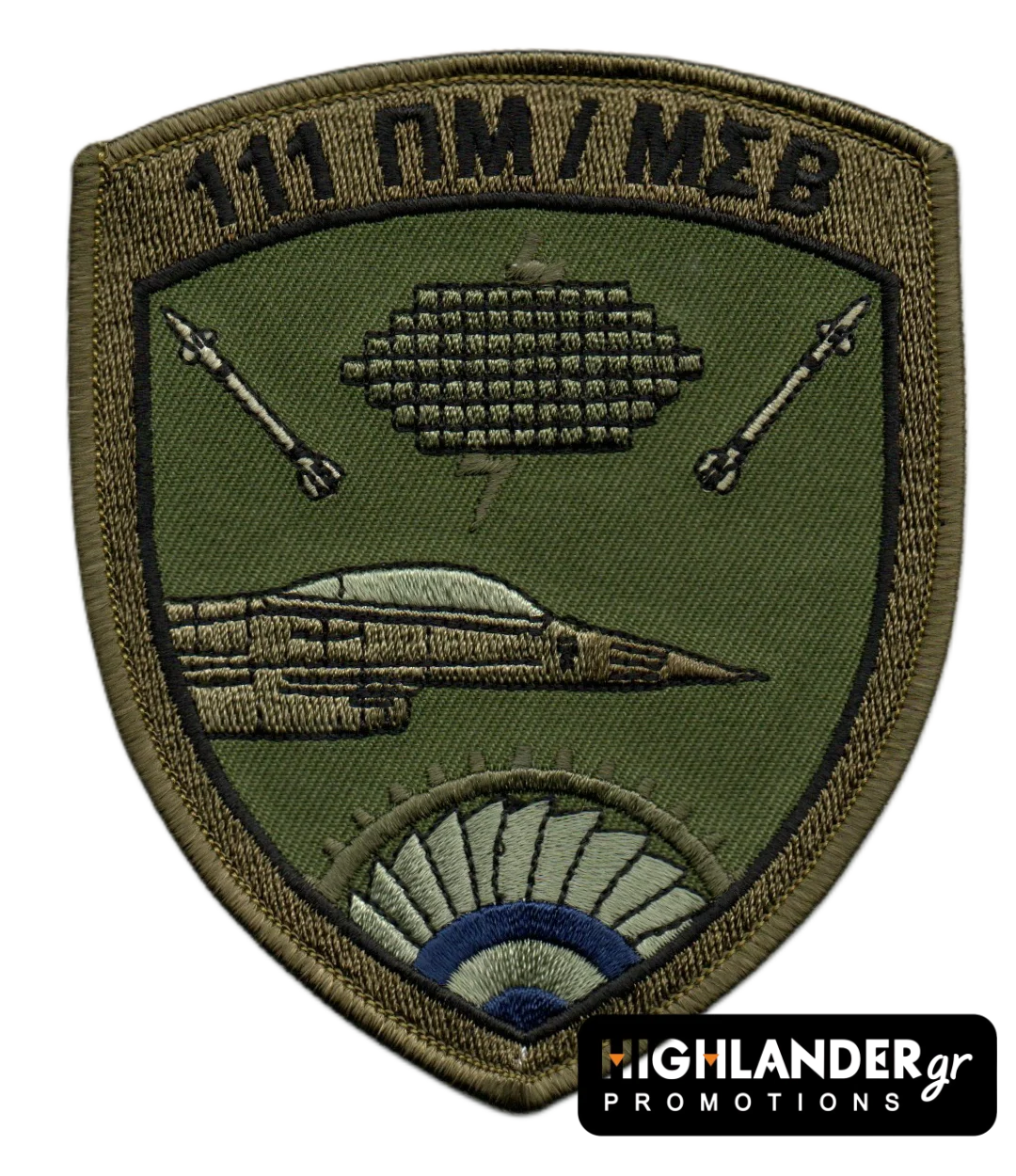 Ραφτό έμβλημα της 111 Πτέρυγας Μάχης / Μοίρας Συντήρησης Βλημάτων (ΜΣΒ) σε low visibility (χαμηλής ορατότητας) χρωματισμούς, σχεδιασμένο για χρήση σε επιχειρησιακό περιβάλλον. Με απεικόνιση F-16, ελληνική ροδέλα και σύμβολα πολεμικής υποστήριξης, είναι ιδανικό για στρατιωτική στολή ή συλλογή.