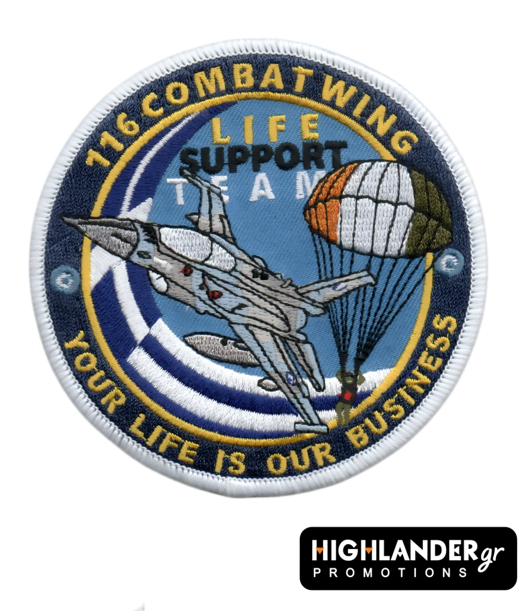 Αυθεντικό και συλλεκτικό σήμα της 116 Πτέρυγας Μάχης (116 Combat Wing) της Πολεμικής Αεροπορίας, αφιερωμένο στην ομάδα Life Support Team. Το σχέδιο παρουσιάζει ένα μαχητικό F-16 εν πτήσει, με φόντο την ελληνική σημαία και έναν αλεξιπτωτιστή, τονίζοντας το σύνθημα "Your Life Is Our Business". Ένα δυνατό μήνυμα για την αφοσίωση και την υπευθυνότητα του προσωπικού που φροντίζει την επιβίωση των πιλότων. Ιδανικό για συλλέκτες, στρατιωτικούς και λάτρεις της αεροπορίας.