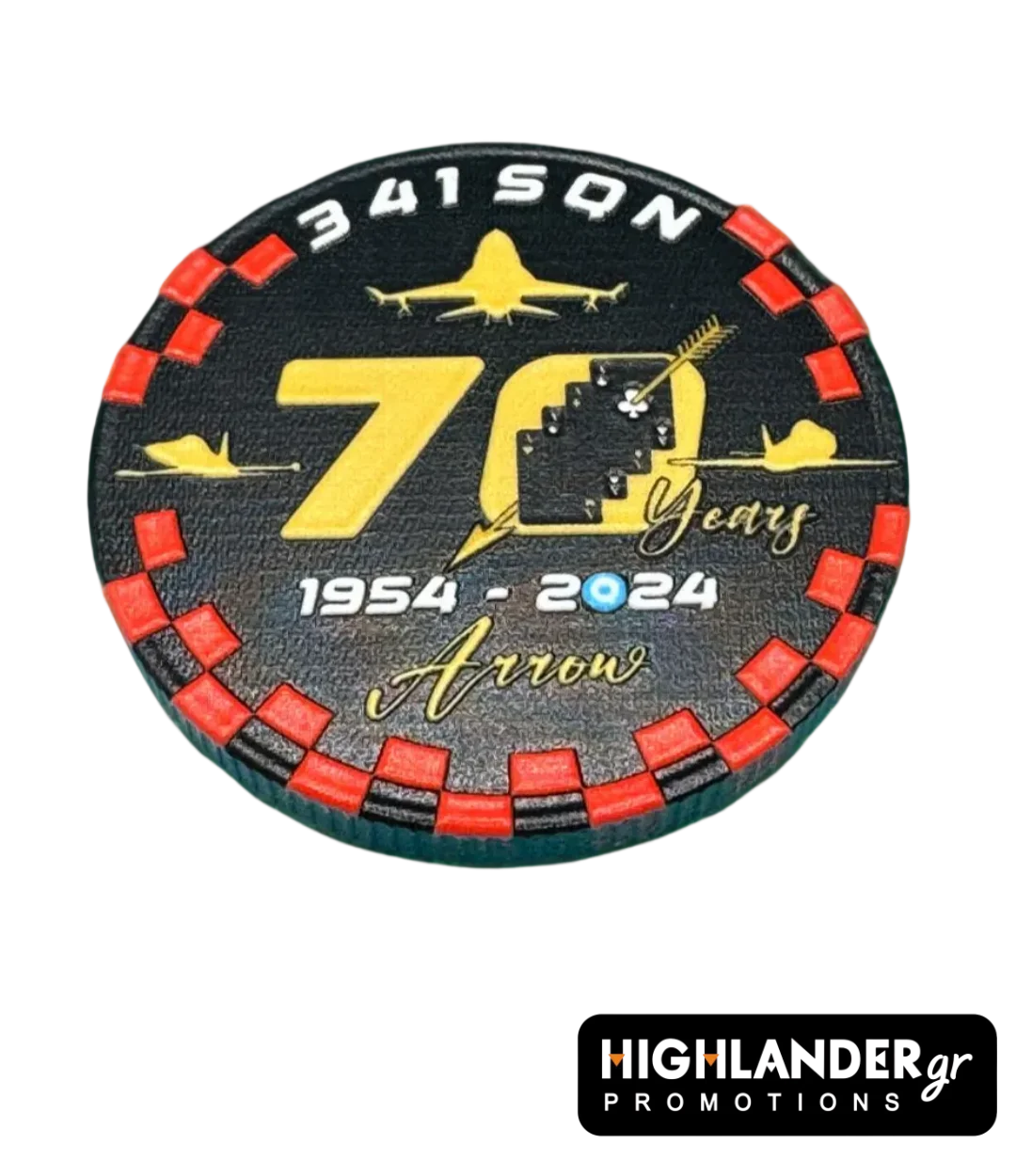 Τιμήστε τα 70 χρόνια ιστορίας της 341 Μοίρας "Βέλος" με αυτό το μοναδικό Αναμνηστικό Νόμισμα (Challenge Coin). Σχεδιασμένο ειδικά για την επέτειο 1954–2024, το νόμισμα ξεχωρίζει χάρη στο ιδιαίτερο στυλ "Μάρκας Πόκερ" (Poker Chip), που συμβολίζει την ελίτ των μαχητών.