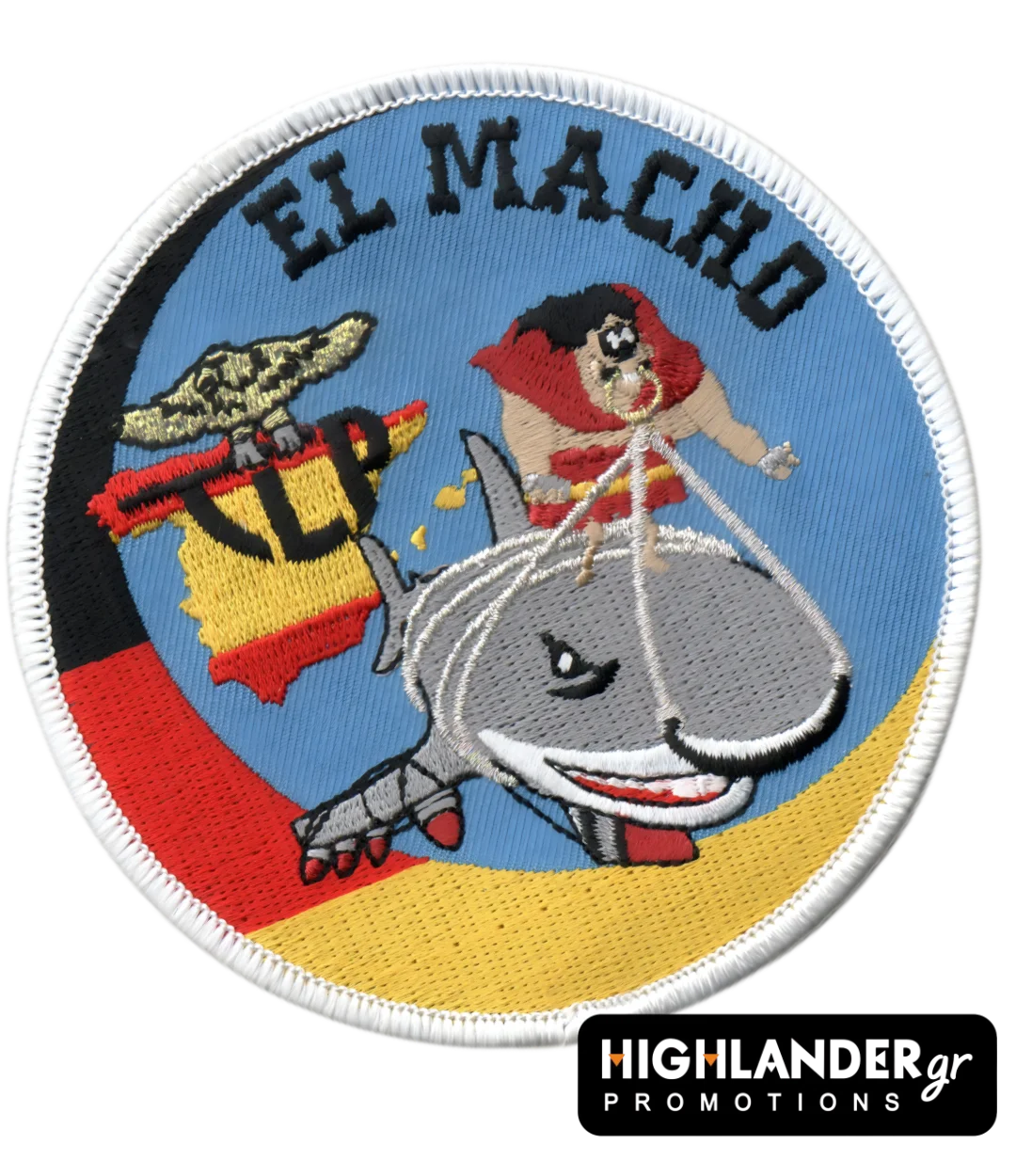 A fun and collectible patch inspired by the legendary TLP (Tactical Leadership Programme) in Spain. Featuring the iconic “El Macho” riding a fierce shark with the Spanish flag in the background – this patch mixes military culture with bold cartoon humor.