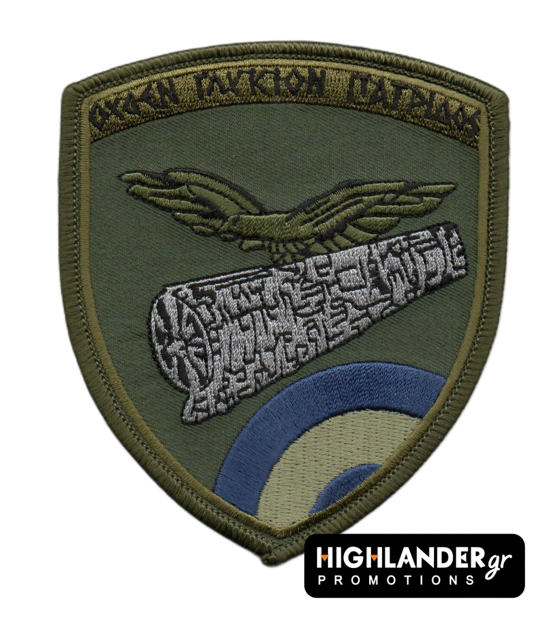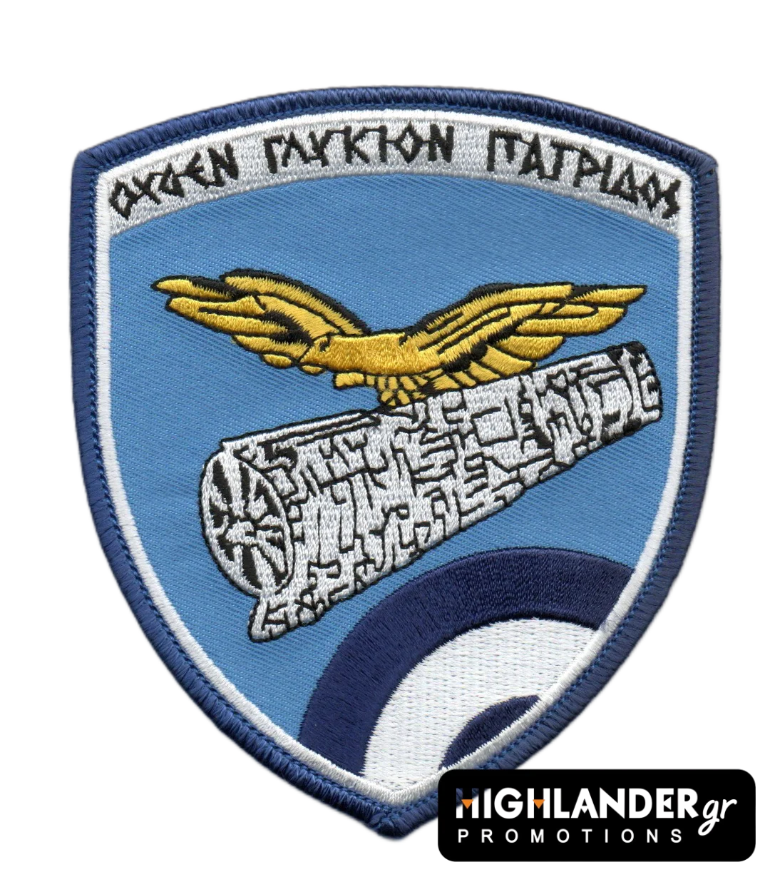 Το κεντητό σήμα φέρει στο κέντρο τον αεροπορικό κινητήρα, πλαισιωμένο από τον χρυσό αετό που συμβολίζει την ισχύ και την υπεροχή στους αιθέρες. Το σύνθημα «Οὐδέν Γλυκίον Πατρίδος» εκφράζει τη βαθιά αφοσίωση στην πατρίδα.