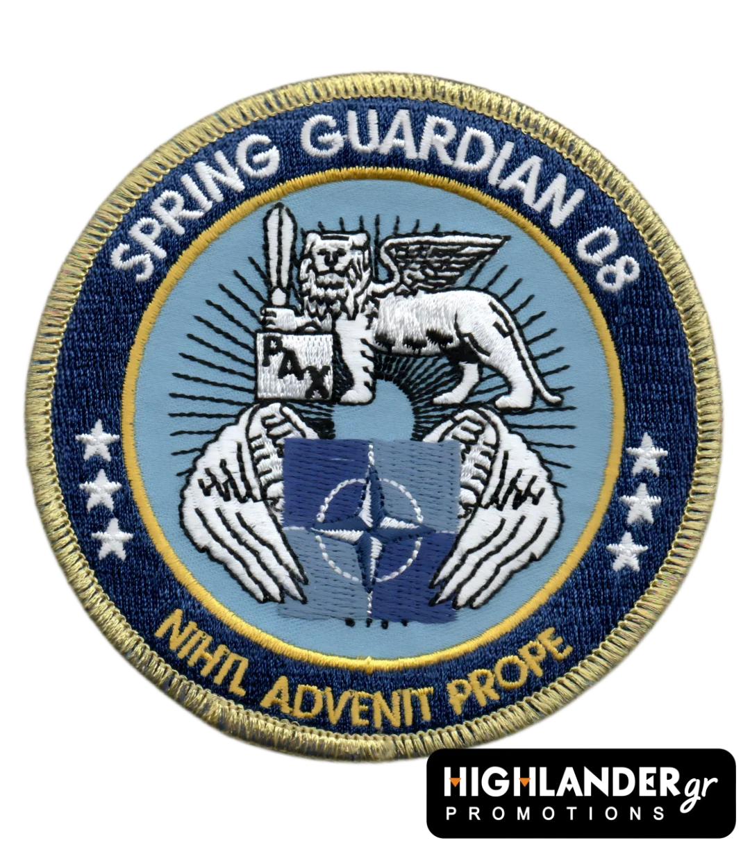 Συλλεκτικό κεντητό σήμα από την άσκηση NATO Spring Guardian 08, με το μότο «Nihil Advent Prope». Υψηλής ποιότητας patch με ιστορική αξία.