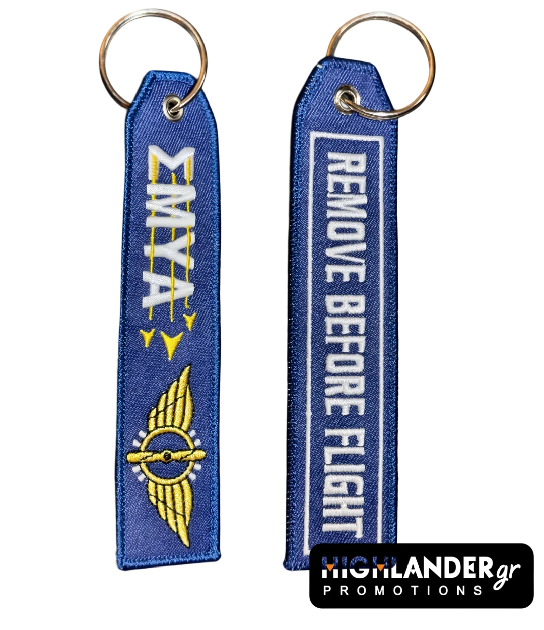 Κεντητό μπρελόκ της Σχολής Μονίμων Υπαξιωματικών Αεροπορίας (ΣΜΥΑ) , με την επιγραφή “Remove Before Flight”. Ένα ξεχωριστό συλλεκτικό αξεσουάρ για όσους αγαπούν την Πολεμική Αεροπορία.