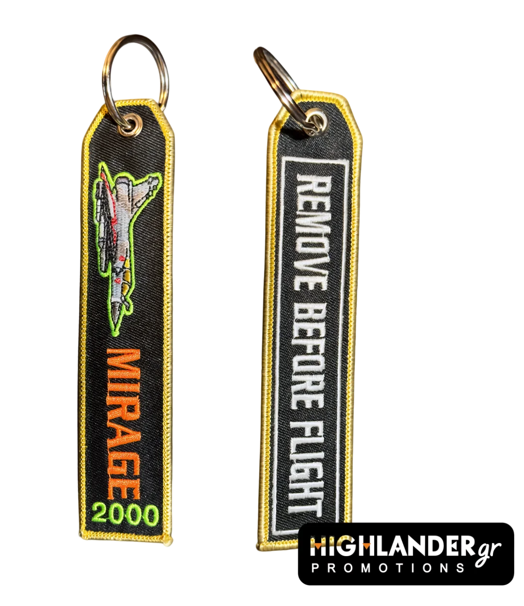 Κεντητό μπρελόκ Mirage 2000 με το χαρακτηριστικό “Remove Before Flight”. Συλλεκτικό και ανθεκτικό, εμπνευσμένο από τα γαλλικά μαχητικά της Πολεμικής Αεροπορίας.