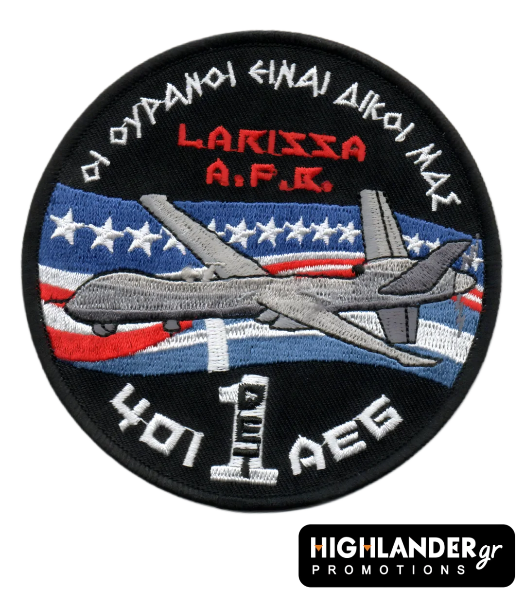 Εντυπωσιακό ραφτό patch της 401 ΜΑΕΔ με το σύνθημα "Οι Ουρανοί Είναι Δικοί Μας" και τοποθεσία Larissa A.P.B. (Air Base). Στο κέντρο απεικονίζεται ένα MQ-9 Reaper UAV σε φόντο με τις σημαίες Ελλάδας και ΗΠΑ, συμβολίζοντας τη στενή επιχειρησιακή συνεργασία. Ιδανικό για συλλέκτες, φίλους της Αεροπορίας και της στρατιωτικής αισθητικής.