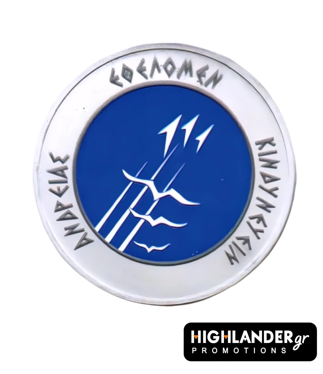 - Front: The wing’s motto “ΕΘΕΛΟΜΕΝ ΑΝΔΡΕΙΑΣ ΚΙΝΔΥΝΕΥΕΙΝ” (We wish to risk with bravery) surrounding a blue core with stylized flight symbols.