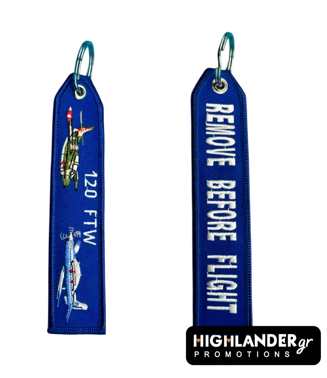 A vibrant blue embroidered keychain honoring the 120 Air Training Wing (120 FTW). Featuring the T-6A Texan II and T-2E Buckeye training aircraft, this tag celebrates the cradle of Hellenic Air Force pilots.
