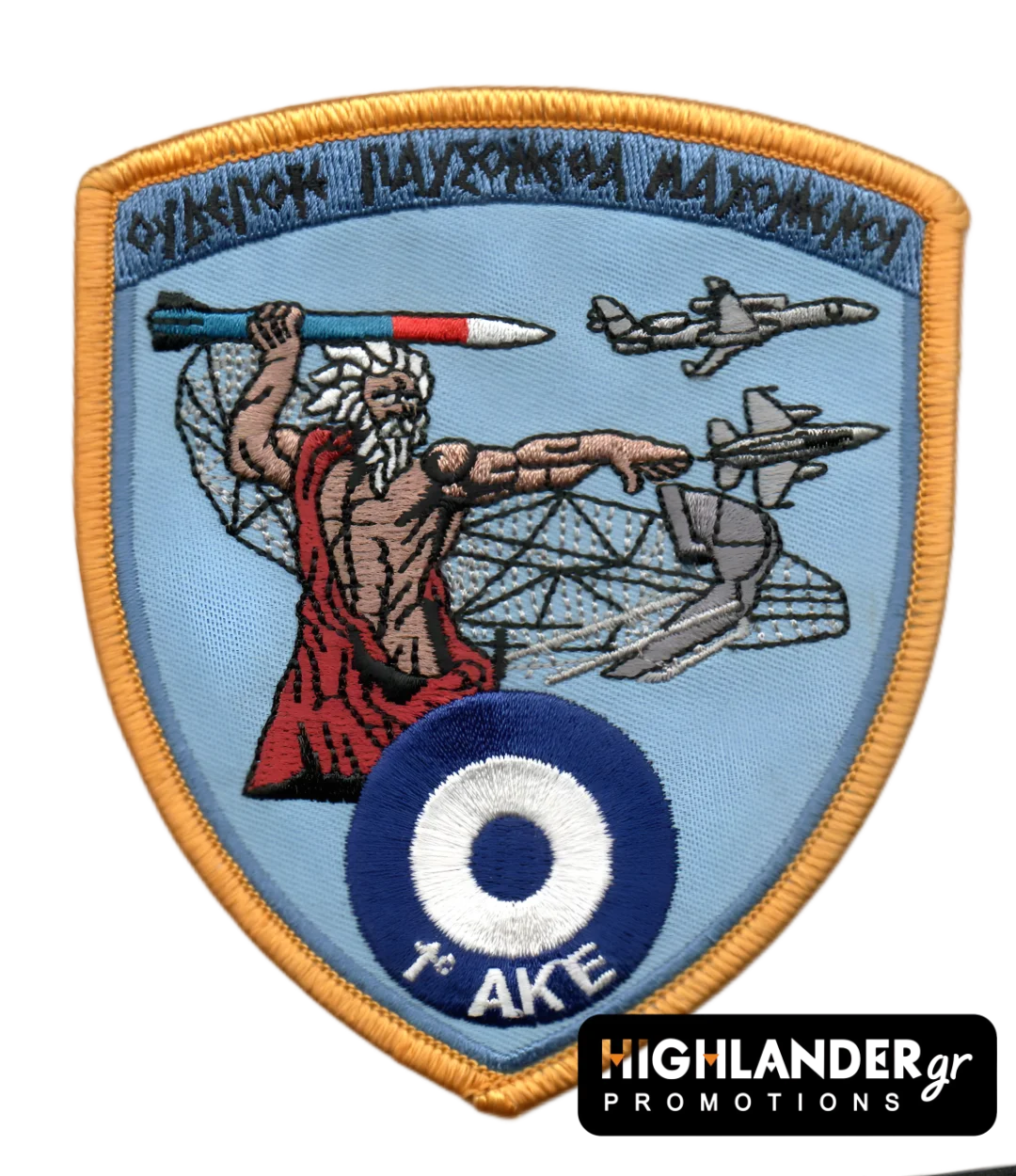 Collector’s patch of the 1st Air Control Center (1st ACC) of the Hellenic Air Force, featuring Zeus launching a missile and the powerful motto “We Shall Never Cease Fighting.”