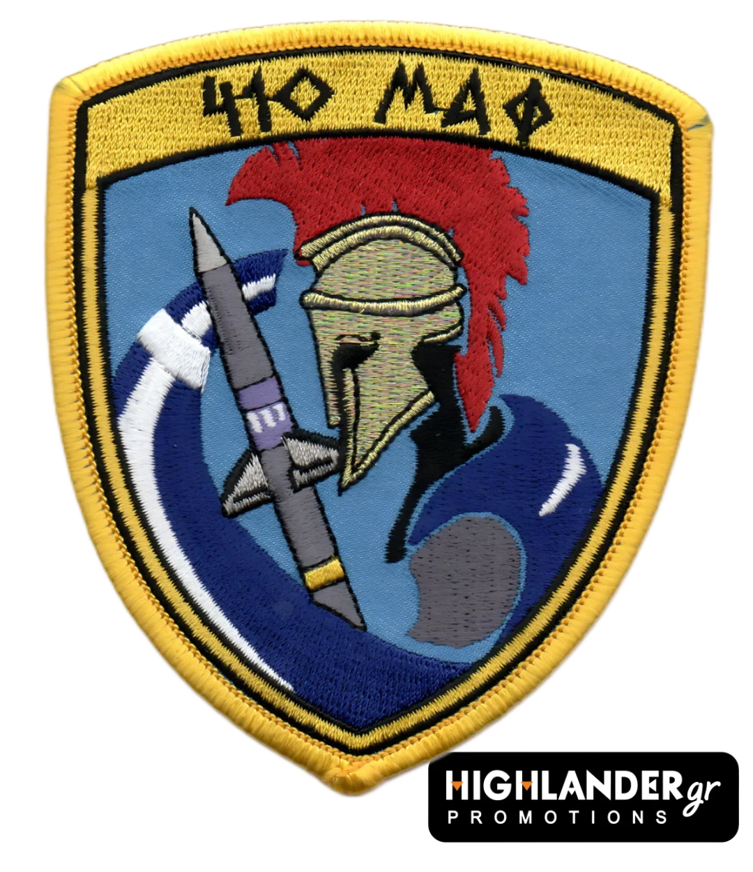 Powerful embroidered patch of the 410 Air Support Squadron (MAF) featuring a Spartan warrior profile holding a missile — a symbol of readiness and strength. The vivid red helmet and Greek roundel highlight the national identity and mission of the squadron. A must-have for collectors and HAF supporters.