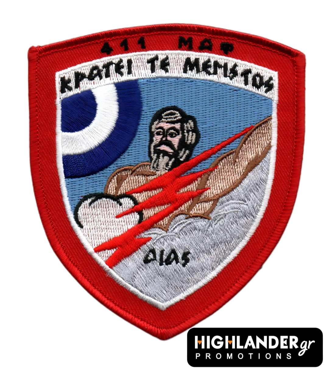 Embroidered patch of the 411 Air Guard Squadron (ΜΑΦ), featuring the god Zeus unleashing lightning bolts from the clouds – a symbol of strength, vigilance and air power. The phrase “Η Πατρίδι τε Μέγιστος” (To the Fatherland, the Greatest) and the Hellenic Air Force roundel highlight the patriotic and mythological elements.