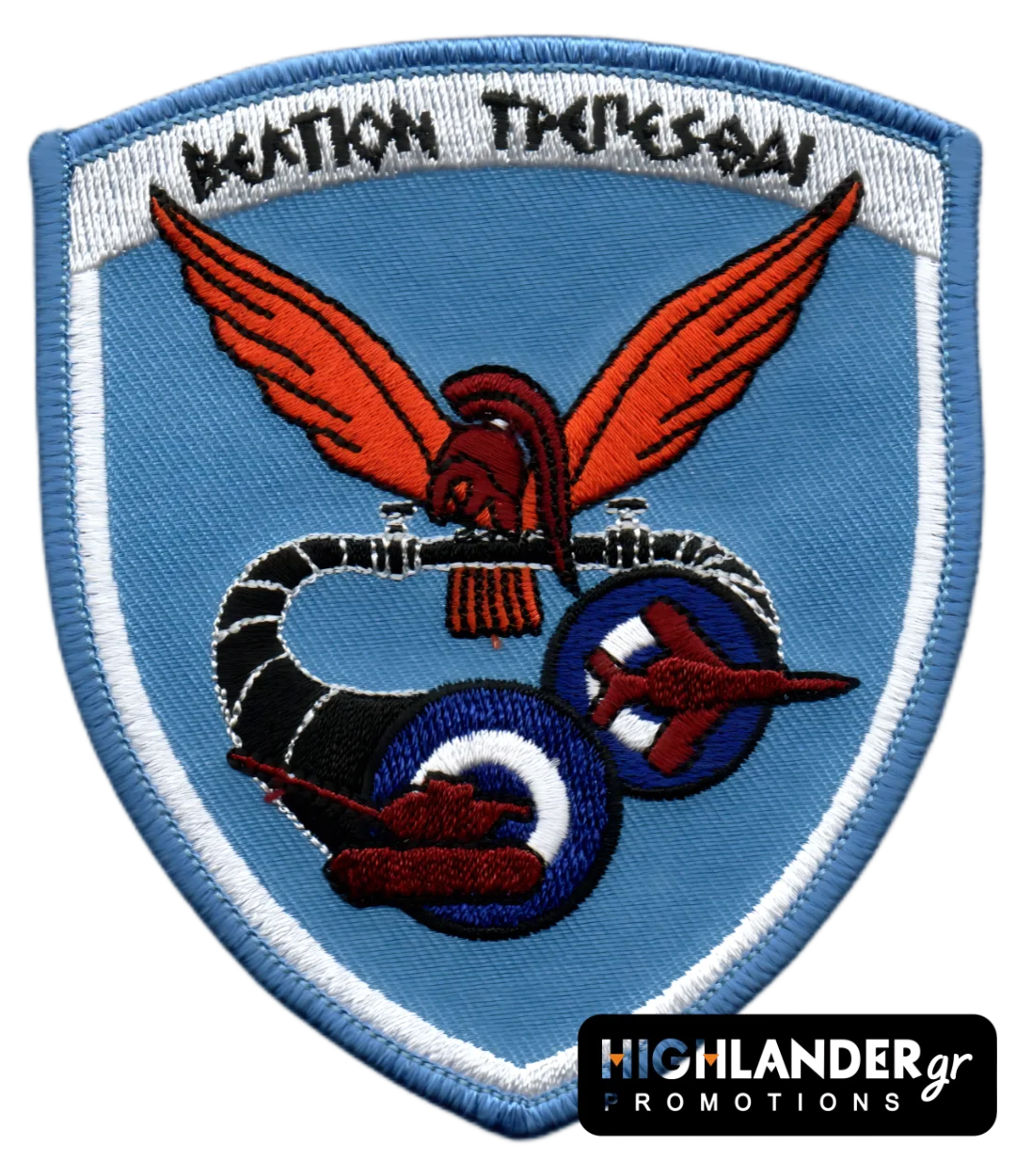 A distinctive embroidered patch featuring the ancient Greek phrase “VELTION TREPESTHAI”, meaning “To Change is Better” – a call to continuous improvement and adaptability. The vivid red-winged phoenix is flanked by a pitot tube and two Hellenic Air Force jets, symbolizing readiness and precision. A sky-blue background ties it all to the domain of flight.