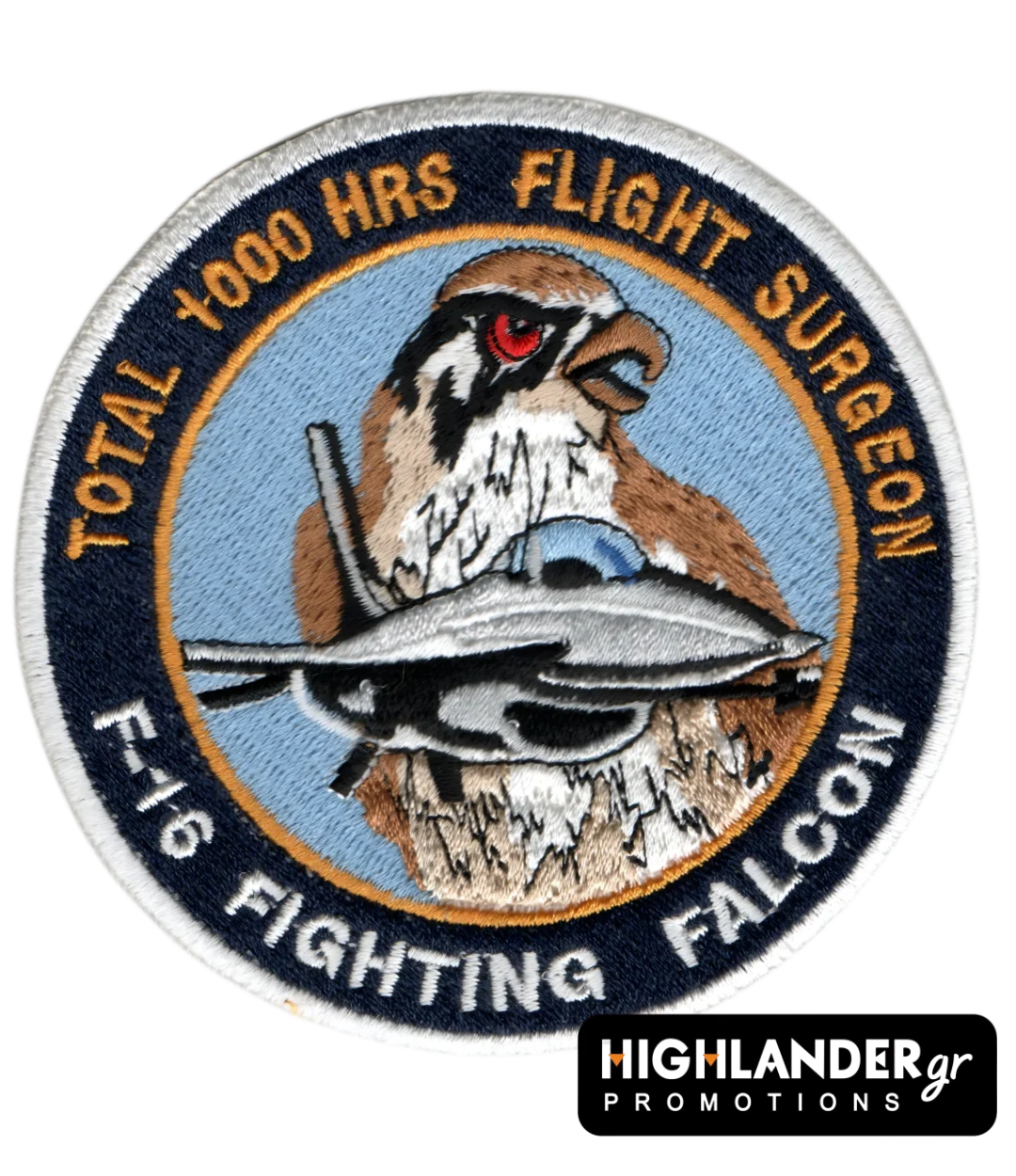 This exclusive embroidered patch celebrates the milestone of 1000 flight hours by a Flight Surgeon aboard the F-16 Fighting Falcon. It features a striking hawk and a front-facing silhouette of the F-16, representing vigilance, excellence, and medical support in the skies. Perfect for collectors, aviation medics, or members of the HAF.