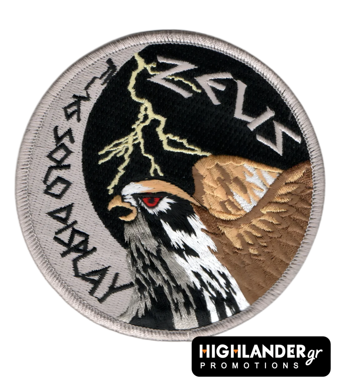 Striking embroidered patch representing the ZEUS F-16 Solo Display Team of the Hellenic Air Force. Featuring a fierce hawk with a bold lightning bolt in the background, symbolizing power and precision. The name “ZEUS” draws inspiration from the Greek god of thunder.