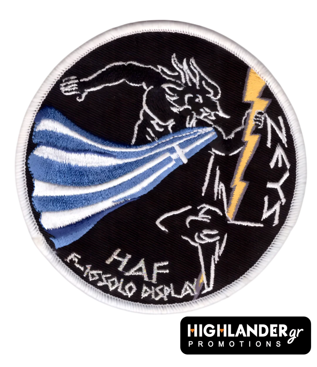 Iconic HAF Zeus Solo Display patch featuring the Greek god Zeus casting a thunderbolt behind the blue-and-white tail of an F-16 jet. A powerful fusion of mythology and modern air power, representing the elite Hellenic Air Force demo team.