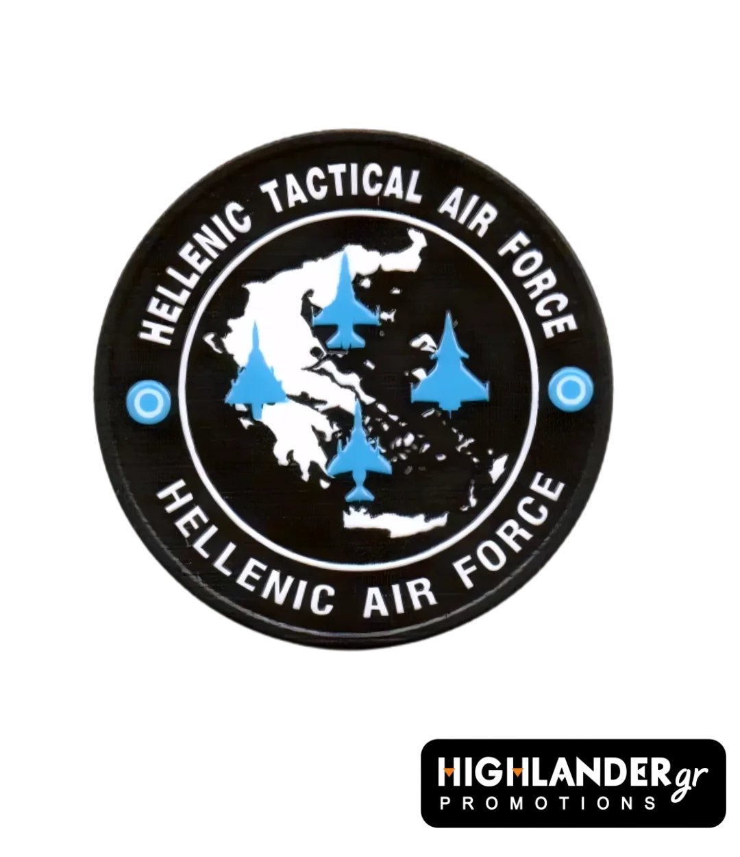 - Front (Obverse): A detailed map of Greece in white against a black enamel background, featuring four blue fighter jet silhouettes patrolling the skies. Surrounded by “HELLENIC TACTICAL AIR FORCE” text.