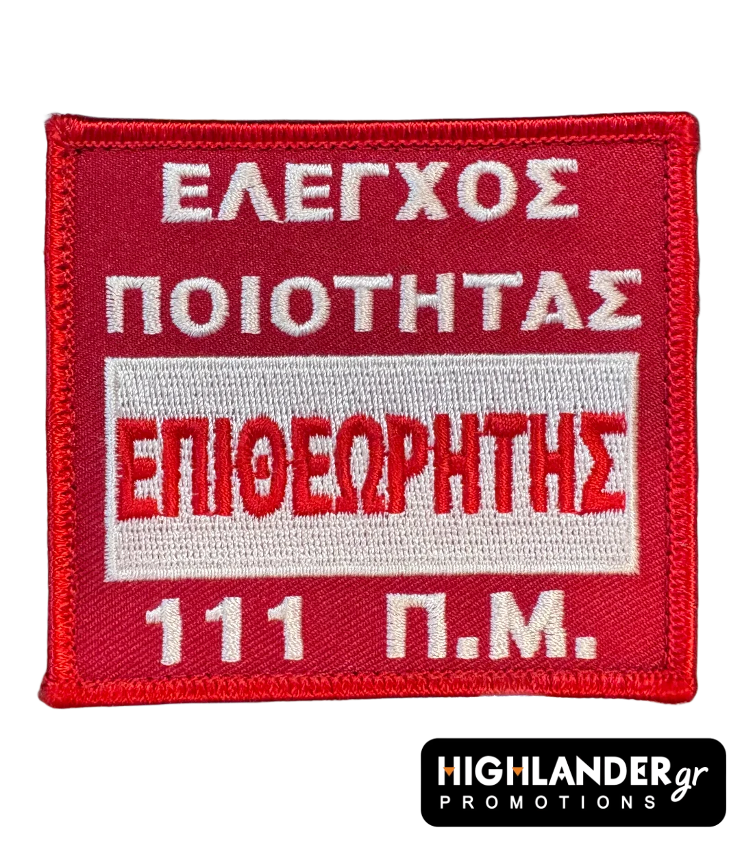 Authentic embroidered Quality Inspector patch from the 111 Combat Wing of the Hellenic Air Force. Features a bold red and white design with Greek wording “Quality Control – Inspector – 111 CW”.