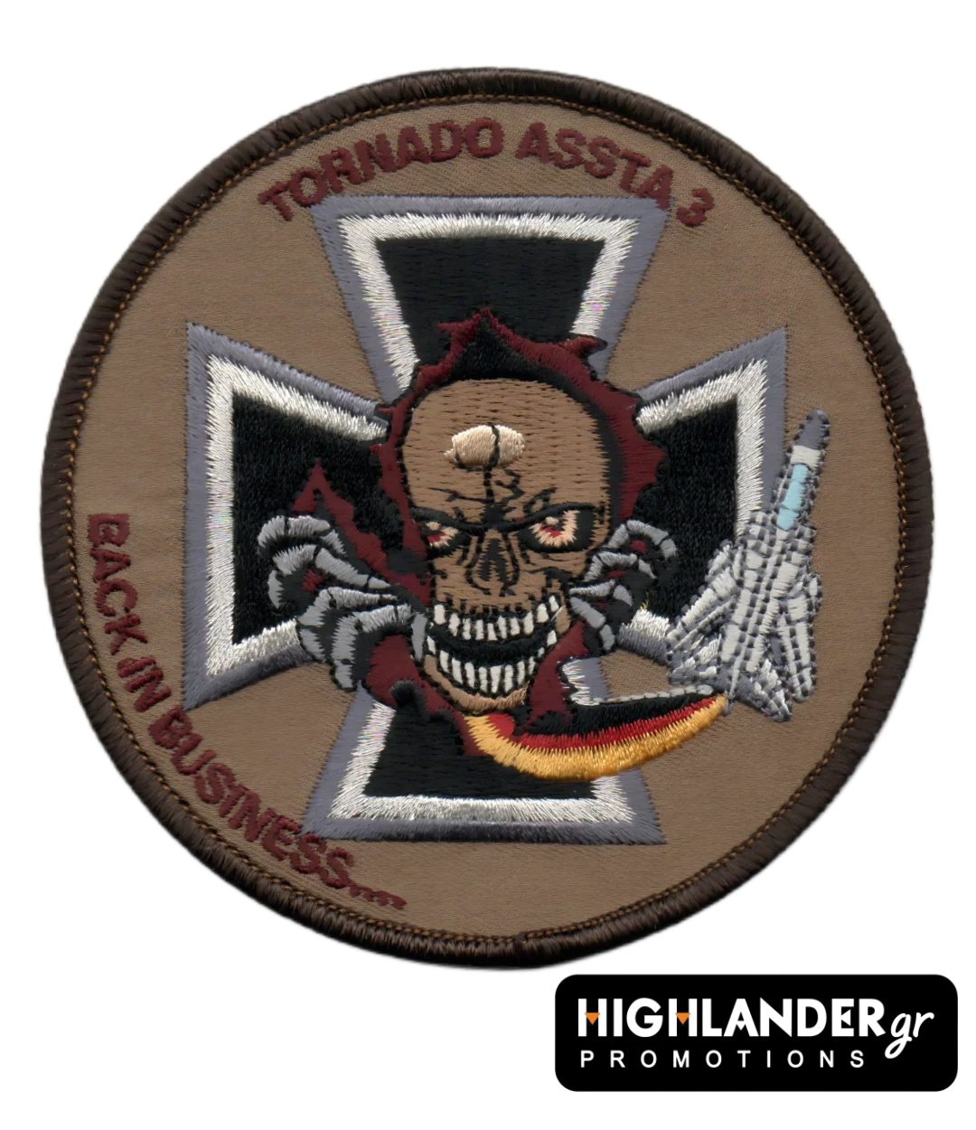 Unique brown round patch featuring the Tornado ASSTA 3 design and the bold slogan “Back in Business…”. A fierce skeleton tears through a German cross background, holding a Tornado fighter jet – perfect for military patch collectors, aviation fans, and tactical gear.