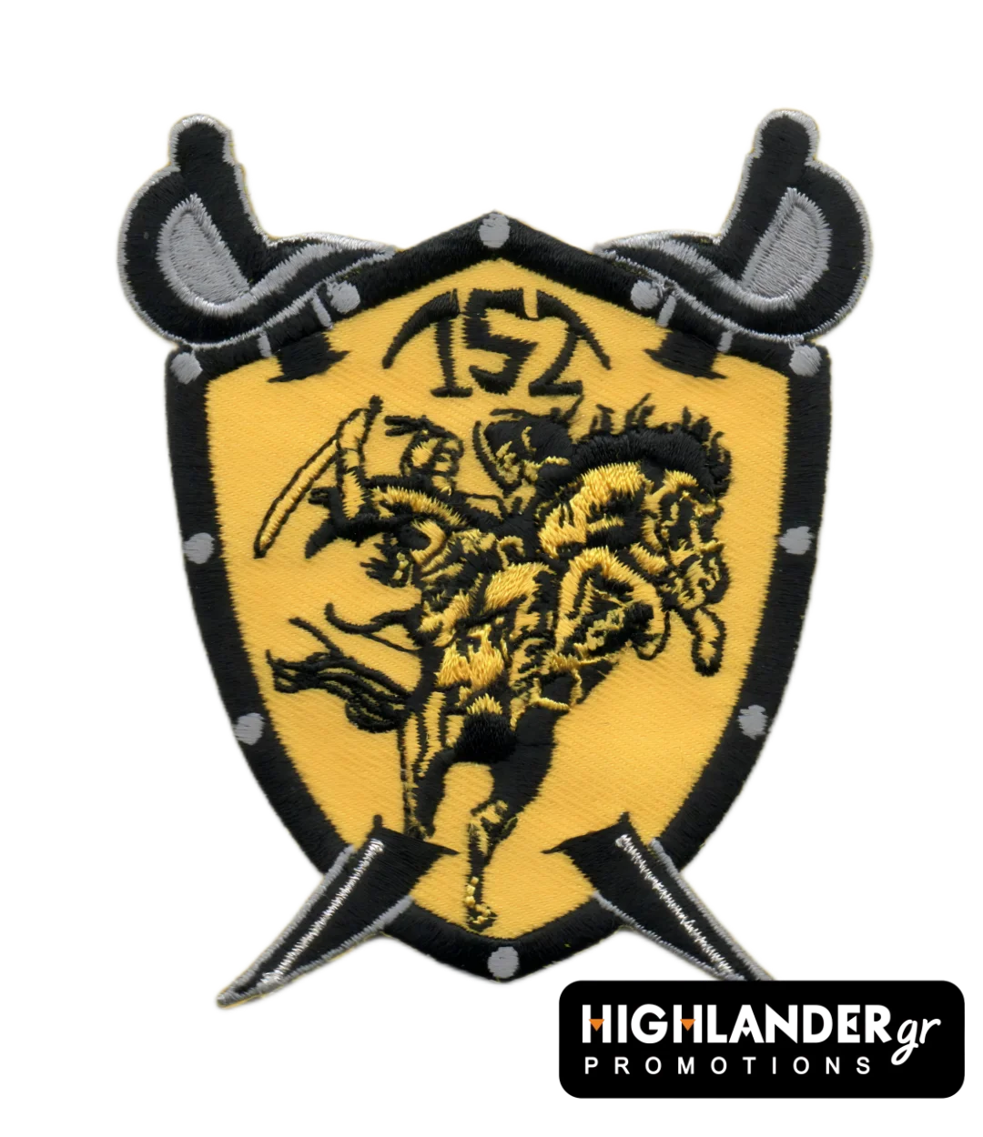 This bold patch represents the 152nd Fighter Squadron of the Turkish Air Force, featuring a dramatic battle scene embroidered on a yellow and black shield. The central image shows two warriors on horseback in fierce combat, symbolizing bravery, strength, and the warrior spirit of the squadron. The number “152” is prominently placed at the top, while crossed sabers and rivet-like details enhance the military shield design.