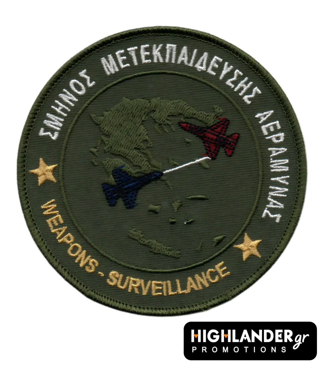 Tactical embroidered patch of the Air Defense Training Squadron, featuring a subdued design with a map of Greece and two intercepting fighter jets. The dark, low-visibility tones make it ideal for field use, while the Weapons – Surveillance motto highlights its operational role in monitoring weapon systems.